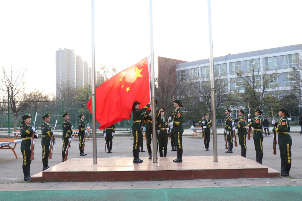 伴随着庄严的国歌声,国旗护卫队迈着铿锵有力的步伐护送着国旗,气宇轩昂地走向升旗台。鲜艳的五星红旗在全院师生的注目礼中冉冉升起。
