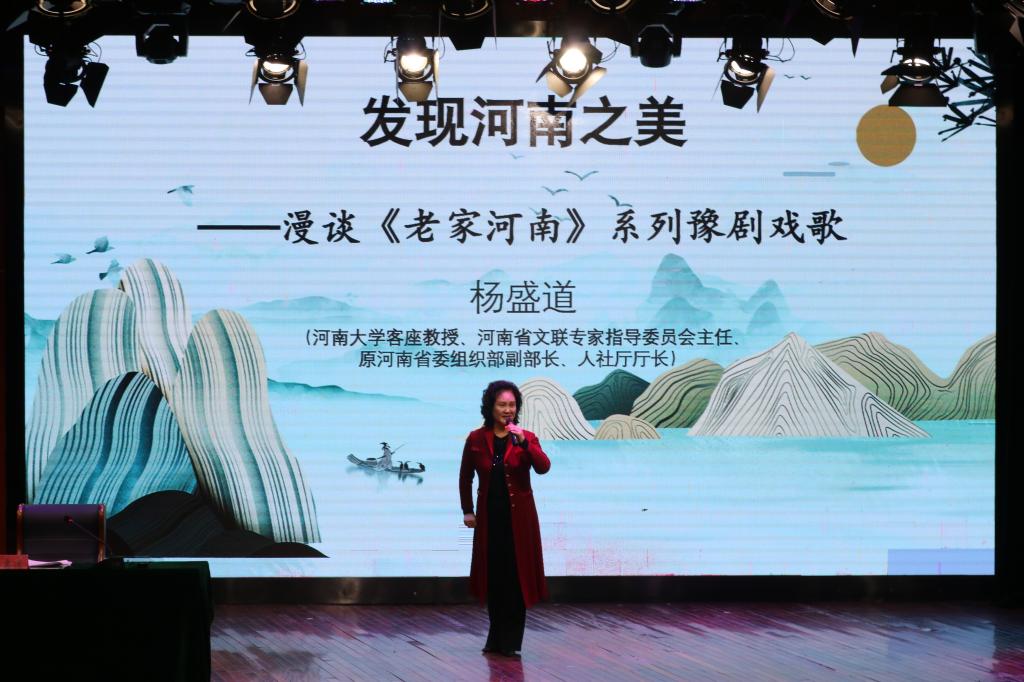 讲座伊始,杨盛道教授阐述了《老家河南》系列豫剧戏歌的起源发展历程、创作目的及其内容鉴赏等知识。杨盛道教授根据习近平在考察河南时的指示表示,当代青年在传承河南豫剧文化的同时要做好创新工作,更好地为促进河南豫剧事业的创新性发展做贡献,让全国人民真正了解河南、爱上河南。杨盛道教授讲解内容丰富,不仅针对“老家河南”豫剧艺术进行了全面地讲解,还鼓励同学们要积极参与相关社会活动。