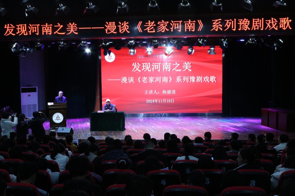 为了弘扬祖国优秀的传统文化,推进河南豫剧艺术的传承与发扬,加强同学们对豫剧的了解,以此更好地提升个人素养,坚定文化自信,凝聚中华民族共识,11月19日下午,周口职业技术学院邀请河南大学客座教授、河南省文联专家指导委员会主任、原河南省委组织部副部长、人社厅厅长杨盛道教授在砺德厅开展“发现河南之美”——漫谈《老家河南》系列豫剧戏歌的讲座。讲座由校党委副书记,工会主席郭汝礼主持。亚洲精品内射口爆党总支书记展贤东、院长史丽珍以及部分教师和学生代表参加本次讲座。