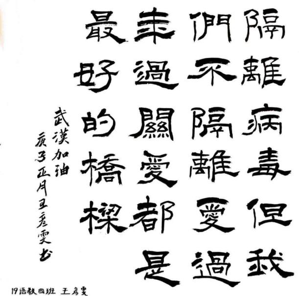 当前,新冠肺炎疫情形势依然严峻,全国人民都投入到这场看不到硝烟的抗疫战争,众志成城、共抗疫情!我院学子用不同方式展现坚决打赢疫情防控阻击战的信心、决心。展现出当代周职学子的青春担当。