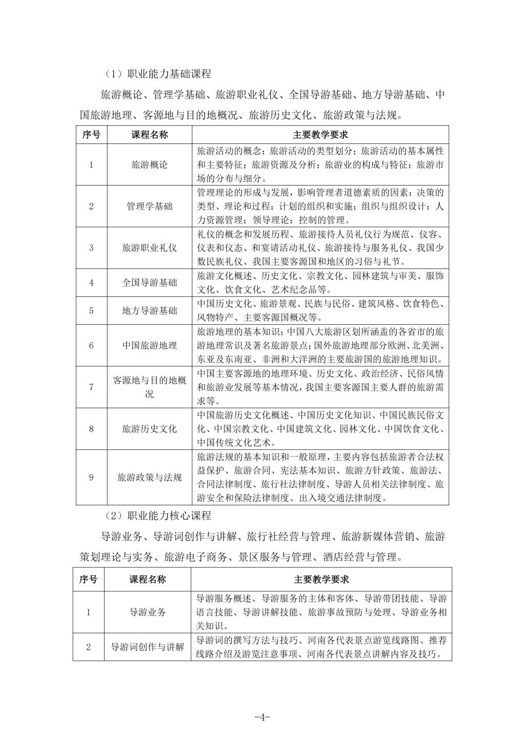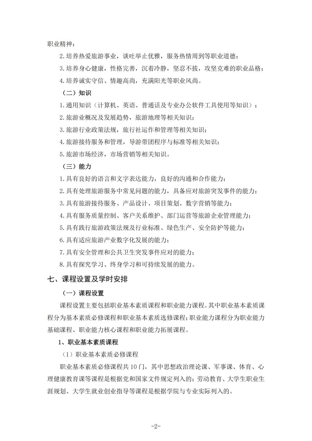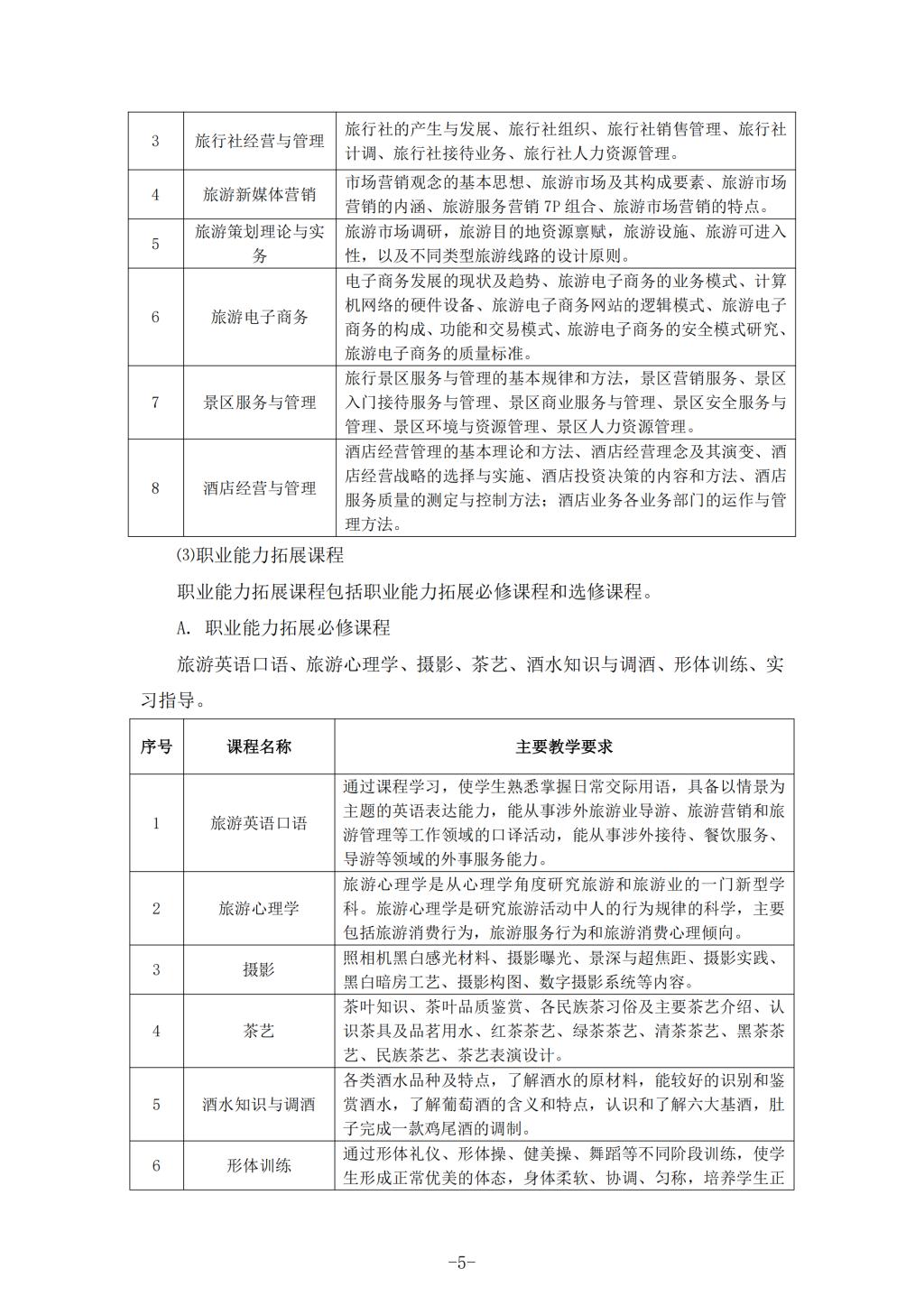 主干课程:管理学基础、旅游概论、中国旅游地理、旅游职业礼仪、导游基础、导游业务、旅游政策与法规、旅行社经营与管理、旅游新媒体营销、导游词创作与讲解、旅游历史文化、旅游策划理论与实务、旅游电子商务、景区服务与管理等。